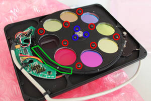 4. Filter wheel with inserted filter holder (the red circles mark the screws that attach the cover to the filter holder, the blue circles mark the screws that attach the filter holder to the backplate of the filter wheel)