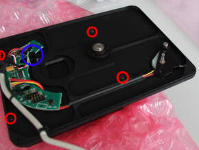 2. Backplate of the filter wheel mounted to the SFT-8300 (the red circles mark the corresponding screws, the blue circle marks the sensor for the filter wheel position)