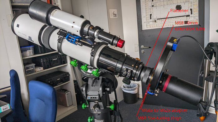 The camera along with the filter wheel, filter, and off-axis guider has a back focus of 56mm. The working distance behind the M76 thread of the reducer is 105.7mm. Thus, a distance of 49.7mm needs to be bridged. Simultaneously, a translation from M76 to M62 thread is required. The former is achieved with an M76 to M68 adapter from TS Optics, a conversion adapter from M68a to M68i, and an adapter from M68a to M62a. These three adapters have an optical path length of 37.7mm. The remaining 12mm are bridged by a 10mm M68 extension and three M68 fine-tuning rings with a total optical path length of 2mm.